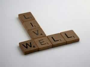 Scrabble tiles arranged to spell "Live Well" on a white background